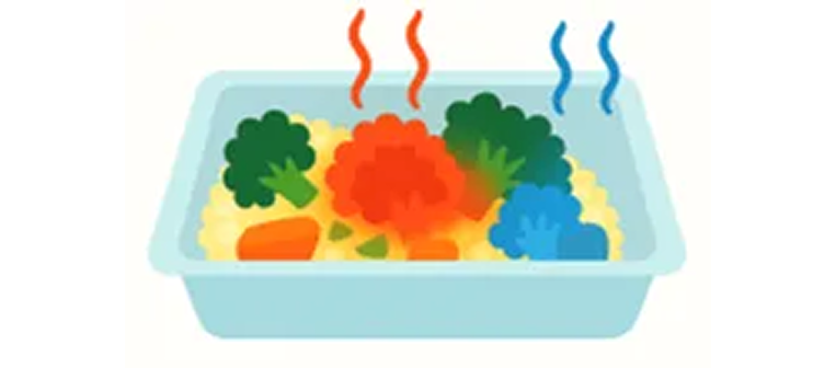電子レンジの加熱で、内圧で開ける方式だと容器変形のリスクがありますが、電子レンジから発生するマイクロ波で孔が開くリコー方式なら、数秒で蒸通孔が開くことで容器変形のリスクを低減できます。また、レンジアップ時に開封不要のため利便性を向上させます。